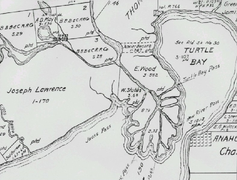 In his history of Cove, Diamond in the Rough, Clark paints a vivid picture of the pioneer dragging his shallow-draught boat over the sandbar at the mouth of the trinity and then poling the vessel up river about a mile before turning westward into a stream that would later be called Old River. "At the confluence of the rivers was a broad expanse of water, some quarter of a mile wide. . . Scanning the horizon to the south, a virtual sea of waist-high marsh grass and salt grass stretched to the shore of Trinity Bay. On the north side of the width of Old River were great fields of sea cane, growing to a height of twelve feet, swaying gently in the southern breeze. Soon the river narrowed, the north bank pushing southward across the mud flats, but gradually widened again. Rounding a slight curve in a more southerly direction at a point where the little Round Lake bayou poured into the river from the north, Lawrence soon saw his destination ahead. The river opened into a large lake, to be known in later years as Old River Lake, and higher land on the south side of the entrance to the lake supported an array of trees and bushes unlike those seen elsewhere on his trek thus far."