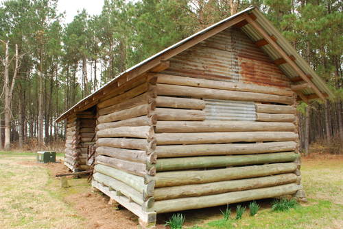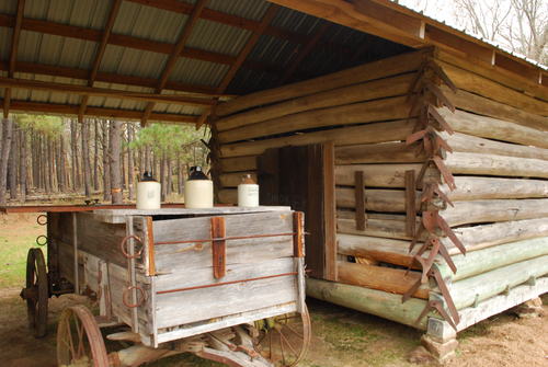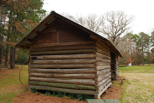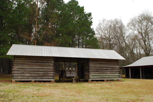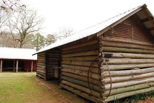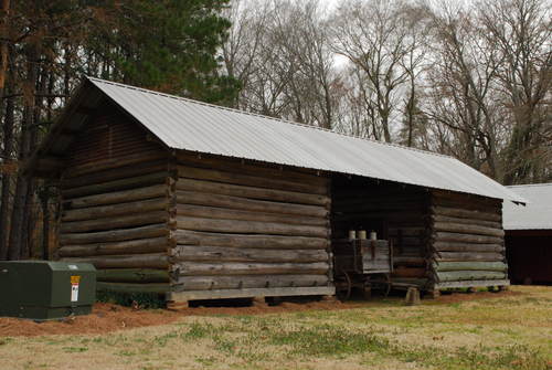Henry Jackson Grant's double pen log corn crib. It was originally located at his old dogtrot homeplace on CR, about a mile north of its present location. It features dovetail notching considered "higher class" compared to less skilled saddle notching or square notching which required a moderate level of skill to produce. A dried crop of corn still in the shucks was piled and stored in each crib. The corn was later used for grits, meal, and livestock food.