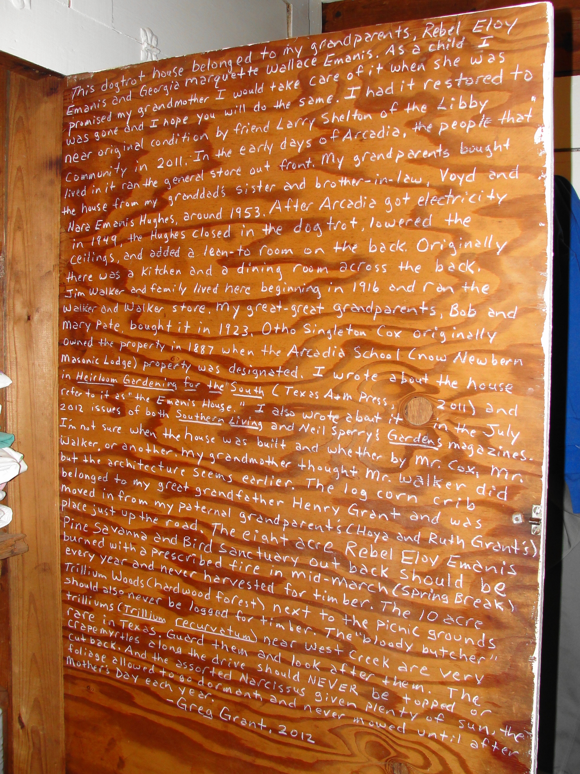 "This dogtrot house belonged to my maternal grandparents, Rebel Eloy Emanis and Georgia Marquette Wallace Emanis. As a child I promised my grandmother I would take care of it when she was gone and I hope you will do the same. I had it restored to near original condition by friend Larry Shelton (Osage Woodworks) of the Libby community in 2011. In the early days of Arcadia the people that lived in it ran the general store out front. My grandparents bought the house from my granddad's sister and brother-in-law, Voyd and Nara Emanis Hughes, around 1953. After Arcadia got electricity in 1949, the Hughes closed in the dogtrot, lowered the ceilings, and added a lean-to room on the back. According to a drawing by my grandmother's aunt Vergie Pate Pesarra there was originally a kitchen and dining room across the back when she lived here as a child. Jim Walker lived here beginning in 1916 and ran the Walker and Walker store. My great-great grandparents, Bob and Mary Pate, bought it in 1923. Otho Singleton Cox originally owned the property in 1887 when the Arcadia School (now Newbern Masonic Lodge) property was designated. I wrote about the house in Heirloom Gardening for the South (TAMU Press, 2011) and refer to it as "the Emanis House." I also wrote about it in the July 2012 issues of both Southern Living and Neil Sperry's GARDENS I'm not sure when the house was built and whether by Mr. Cox, Mr. Walker, or another. My grandmother thought Mr. Walker did, but the architecture seems earlier. The log corn crib belonged to my great grandfather Henry Grant and was moved in from my paternal grandparents (Hoya and Ruth Grant's) place just up the road. The 8-acre Rebel Eloy Emanis Pine Savanna and Bird Sanctuary out back should be burned with a prescribed fire in mid-March (Spring Break) every year and never harvested for timber. The 10 acre Trillium Woods (hardwood forest) next to the picnic grounds should also never be logged for timber. The crape myrtles should never be topped. And the assorted Narcissus given plenty of sun, the foliage allowed to go dormant, and never mowed until after Mother's Day each year. -Greg Grant, 2012"