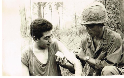 This small town boy didn't shirk his duty to his country, far from it. Jim was drafted into the army and entered active duty on February 1, 1966. He worked in an Evacuation Hospital near Saigon. The last photograph selected for this column depicts Jim "patching someone up". Among the many metals awarded Swink were the Purple Heart and the Bronze Star for heroism in ground combat on 30 May 1967.