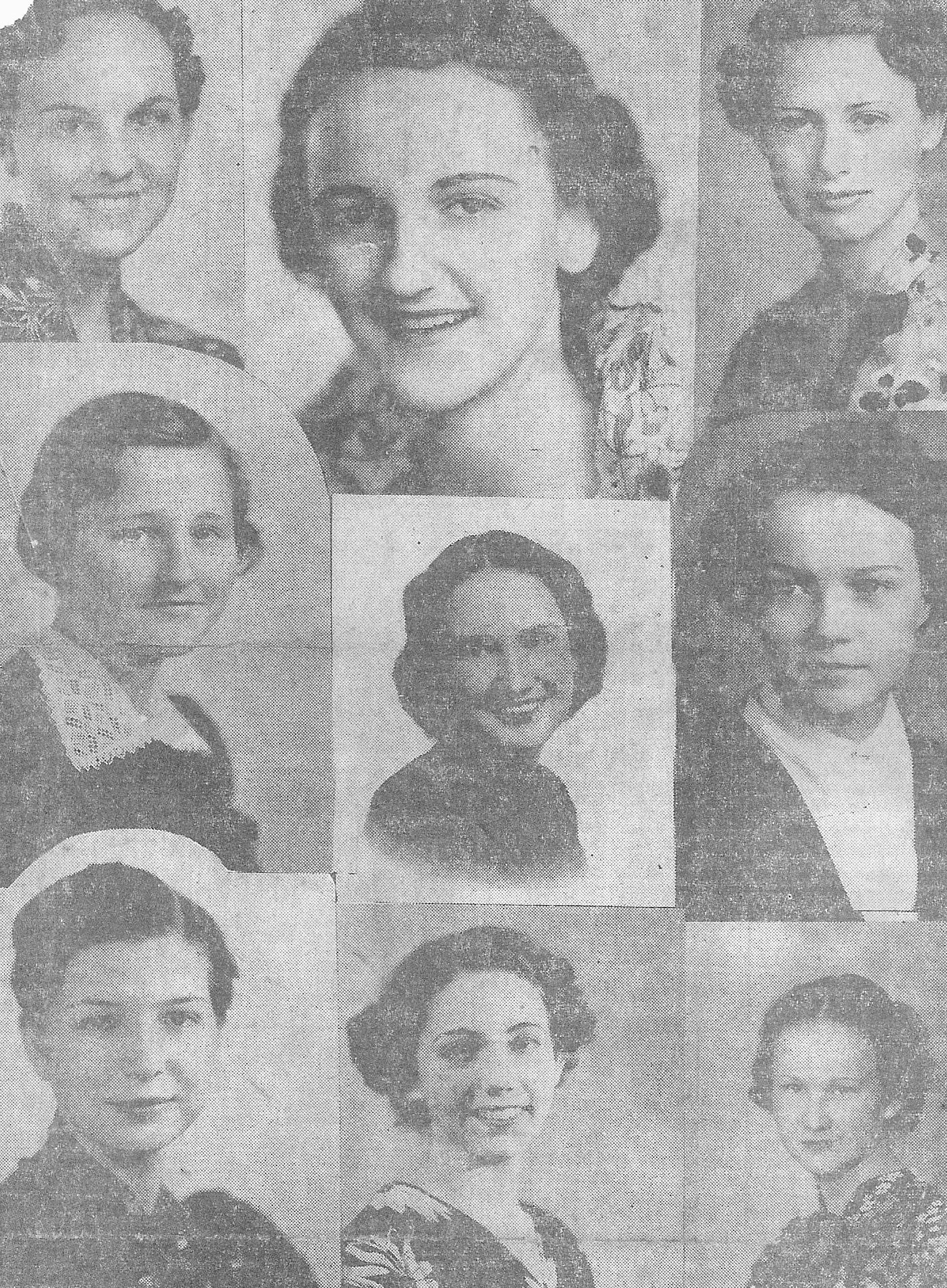 The fourth Jacksonville Tomato Queen and eight of the princesses are pictured in the 1937 newspaper clipping top row, left to right: Virginia Earle of Alto, Queen Geraldine Peacock of Jacksonville, Emodean Acker of Dialville. Middle Row: left to right: Navoleine Ross of Mixon, Julietta Jarvis of Troup, Essie Elizabeth Slaughter of Corsicana. Bottom Row: l to r: Dana Sherman of Wells, Elizabeth Stafford of Palestine and Katherine Boone of Athens.
