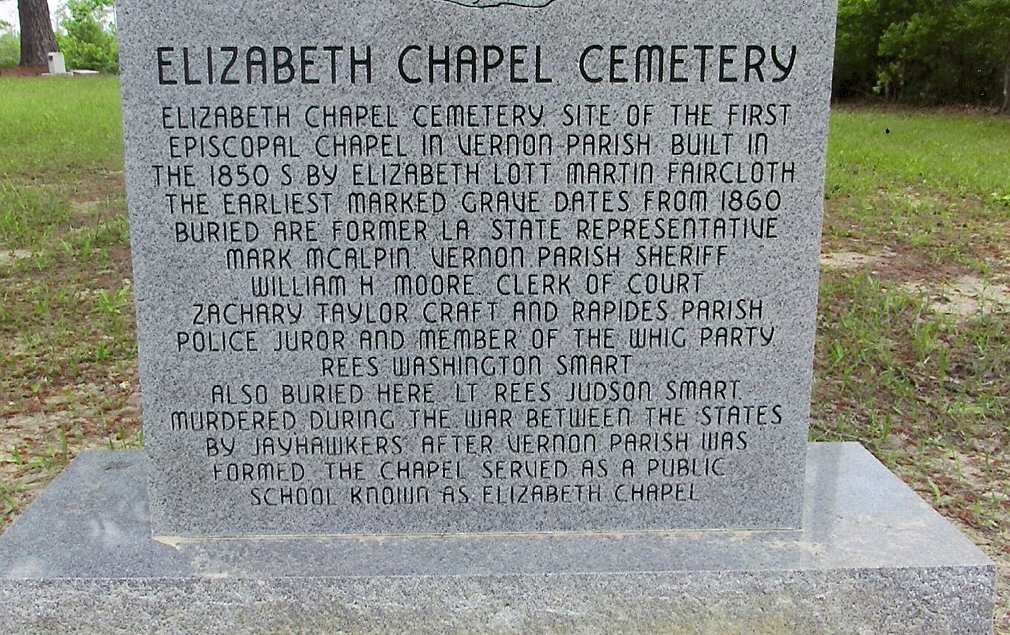 At Elizabeth Chapel Cemetery are buried many of the first elected officials of present day Vernon Parish and some from the days of this area being in Rapides Parish. Buried in this cemetery is Mark McAlpin, who was the very first State Representative for the new Vernon Parish. Mark McAlpin was a plantation owner who resided south/southwest of Anacoco, La. in then Sabine Parish. When Louisiana seceded from the Union, he was one of many men from the area near Anacoco who gathered at Anacoco Baptist Church and were mustered into the service of the Confederate States Army as Company B 17th Louisiana Infantry. This unit fought with distinction at Shiloh and Vicksburg and held the Yankee attack back as the Confederate units retreated into the town of Vicksburg. When the Confederates surrendered at Vicksburg in July 1863, Mark was across the Mississippi River with part of the 17th Louisiana guarding supplies for the besieged fortress. When Vicksburg surrendered Mark and the others retreated and joined up with General Richard Taylor. He later fought at Mansfield and Pleasant Hill and throughout the campaigns that pushed the Yankees back to Baton Rouge. While away in the army, a young Confederate soldier, lost from his unit, was sitting under the big oak trees at Mark's plantation strumming on a banjo when several Union Army scouts rode up. They asked the young Johnny Reb what he was doing. He replied "just plucking away". Little did he know but when Mark returned he named his plantation "Pluckaway". He was the State Representative when the new "reconstruction parish" of Vernon was formed and Confederate soldiers were allowed to vote again under the 15th Amendment. In the legislature he fought continuously to have all the Union Army detachments removed from Louisiana. In March of1876 Mark contracted typhoid fever and passed away on March 31, 1876 at the age of 49. He is buried in Elizabeth Chapel Cemetery with his wife and eleven of his twelve children. And due to his efforts in 1877 the Union Army garrisons were removed from Louisiana.