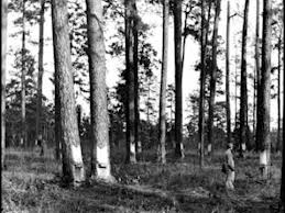 Pine trees in forest being tapped to obtain the resin to be processed into turpentine. (Robertson Collection)