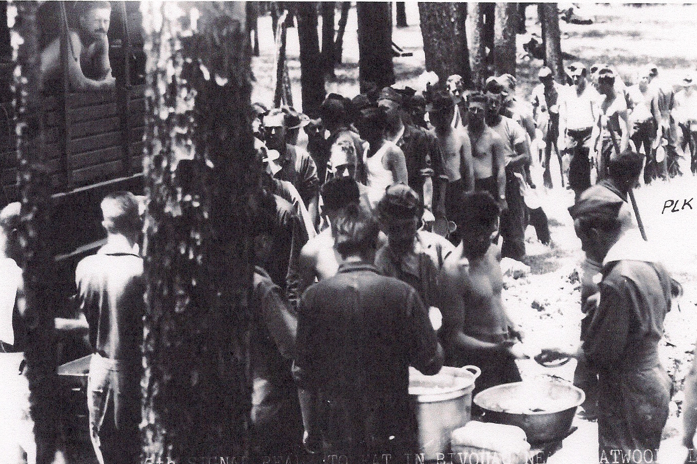 Army Troops in a chow line during the Louisiana Maneuvers. Unused rations were often buried and local folks were told where to dig them up so they could be used. (Robertson Collection)