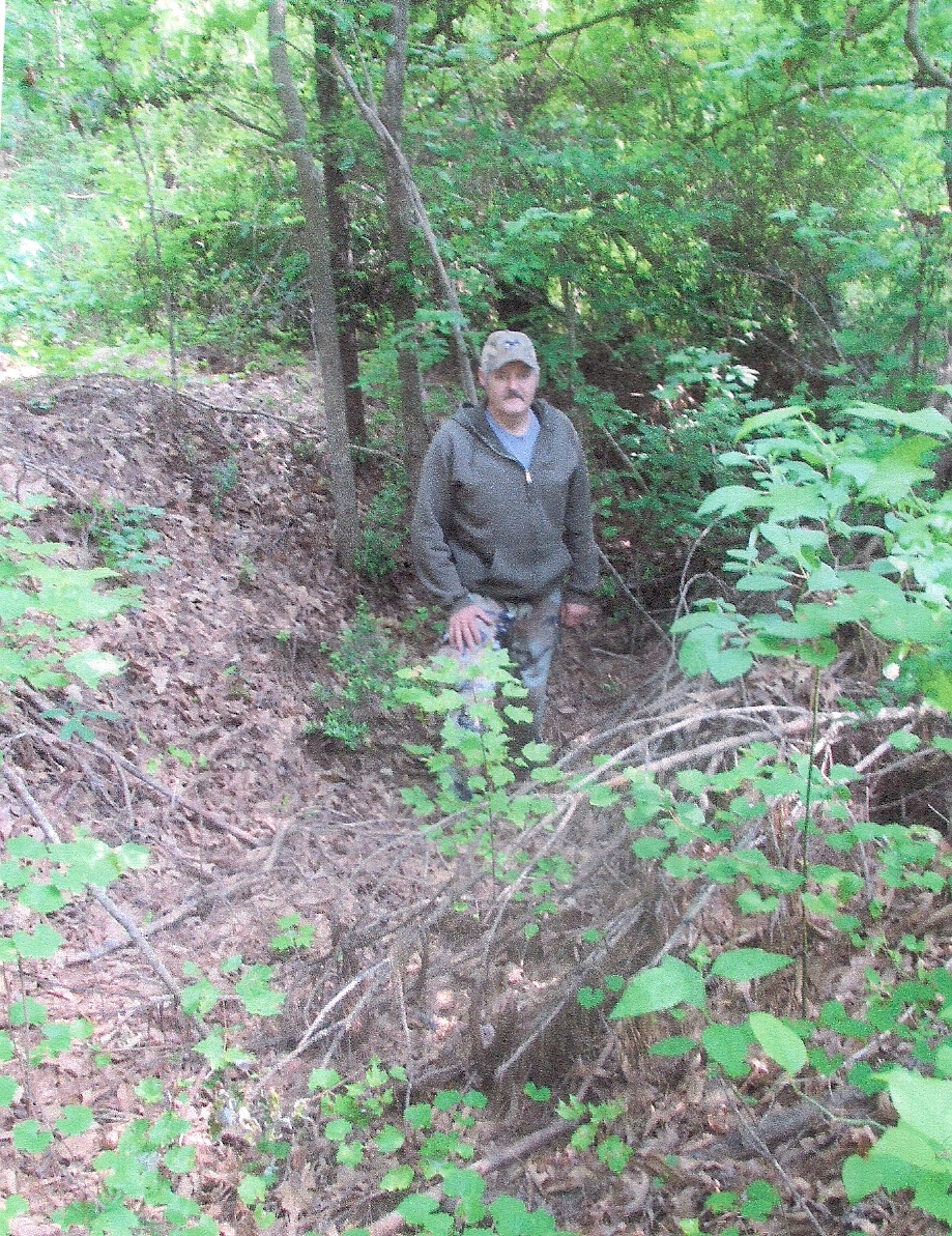 The author standing in the old trench of 1941 that his father ran off into with his precious can of gasoline. Sites such as this can still be found throughout the area. (Robertson Collection)