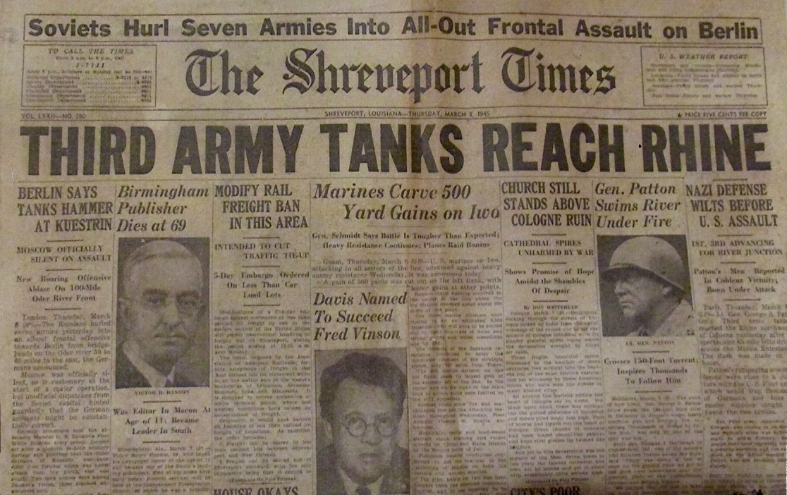 March 8, 1945 Shreveport Times article showing General Patton's Third Army advancing against the Germans. (Robertson Collection)