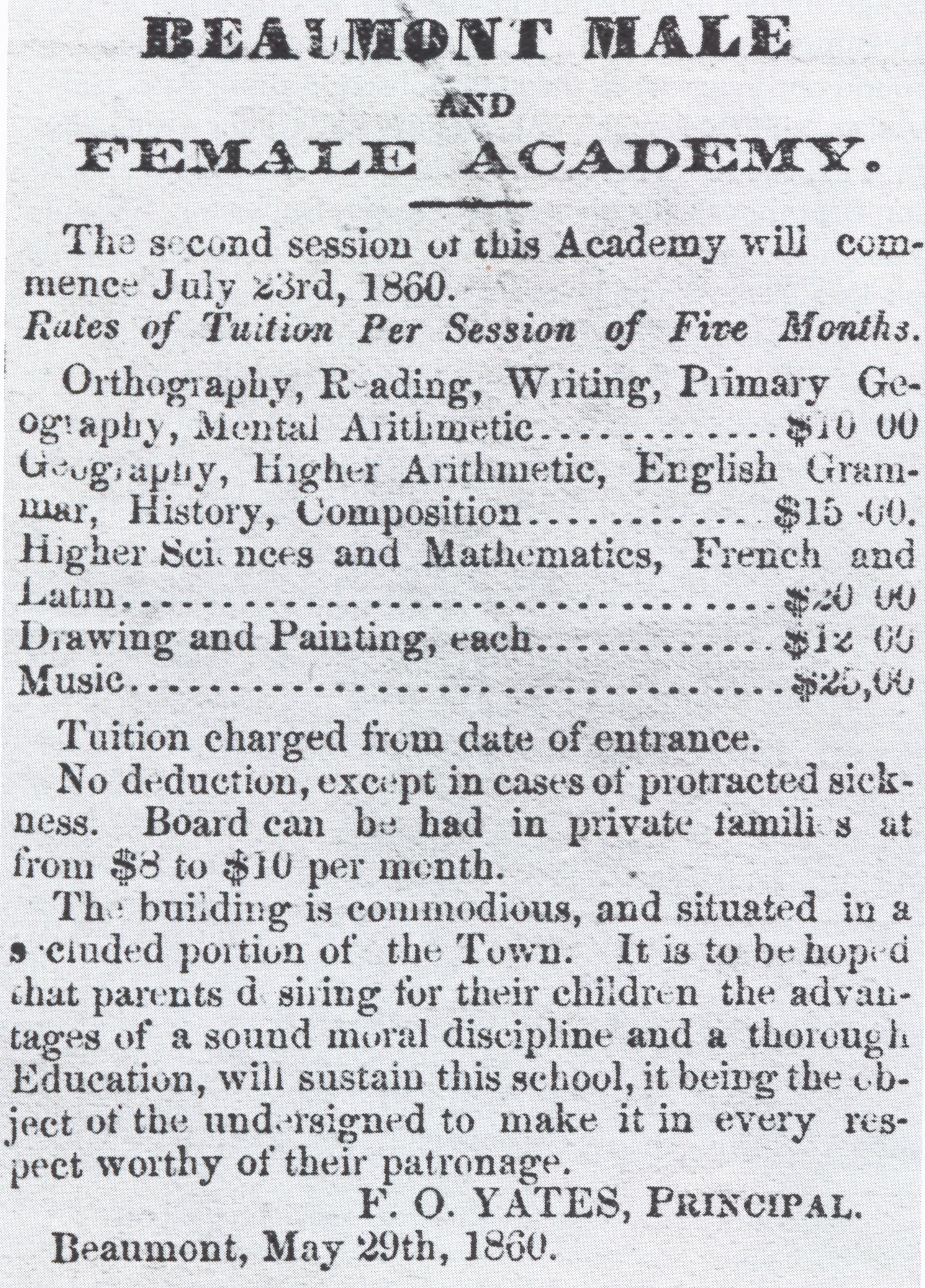 In 1858, the Beaumont Male and Female Academy offered reading, spelling, writing, and arithmetic, plus "primary geography, higher mathematics and painting." Tuition was $10-$25 per session; board in private homes ranged from $8-$10 per month.