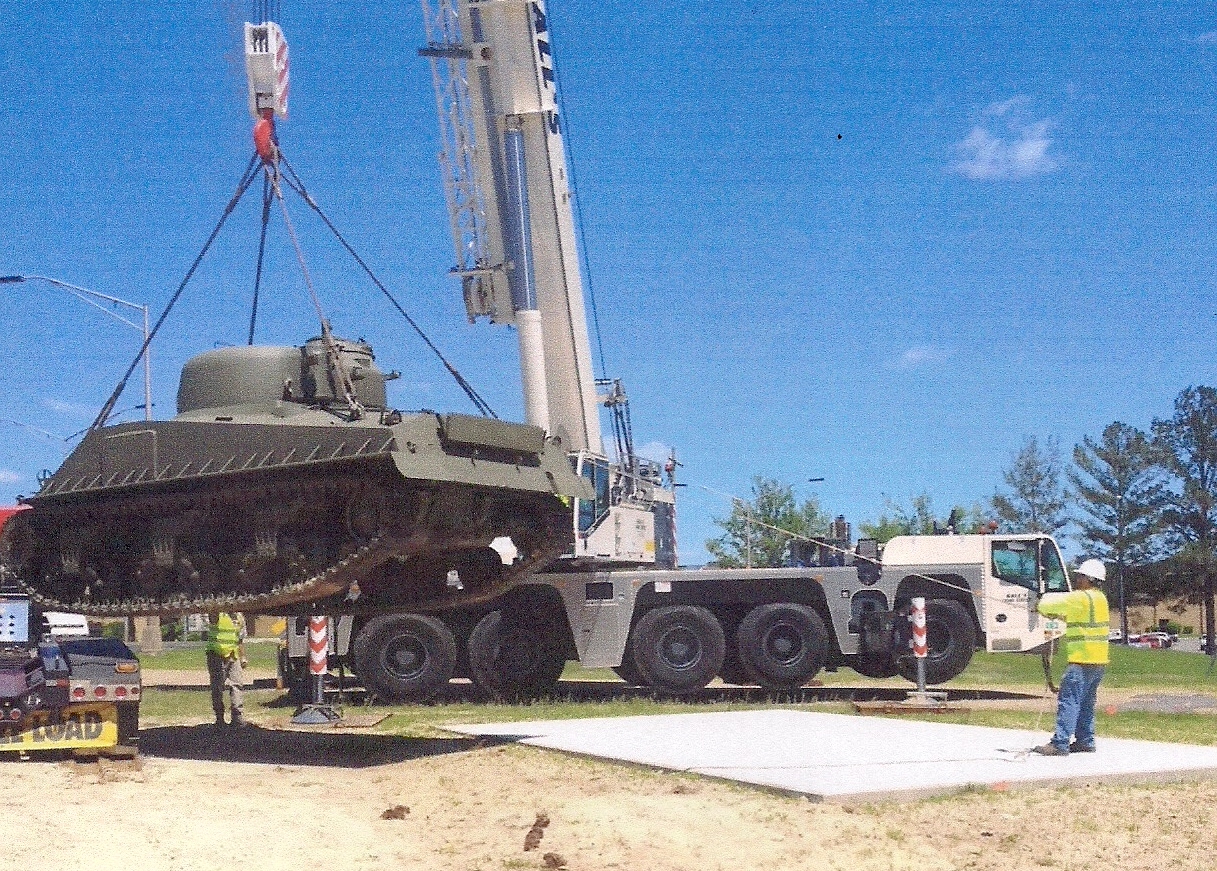 Heavy crane lifting the Sherman tank onto its new concrete pad at the Fort Polk Museum. (Fort Polk Museum Collection)