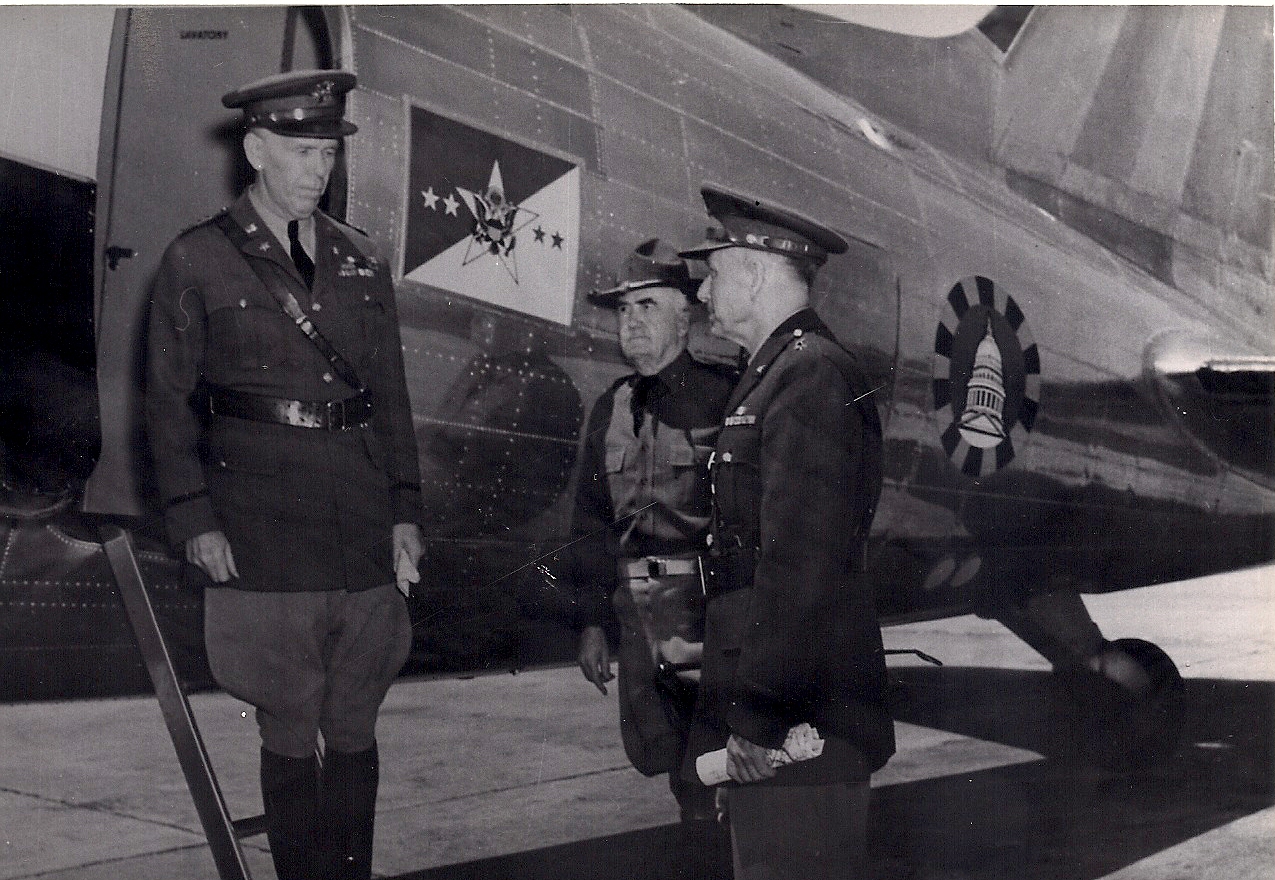 General Marshall arrives at Esler Field and steps down from his personal military aircraft to begin his review of the Louisiana Maneuvers. (Robertson Collection)