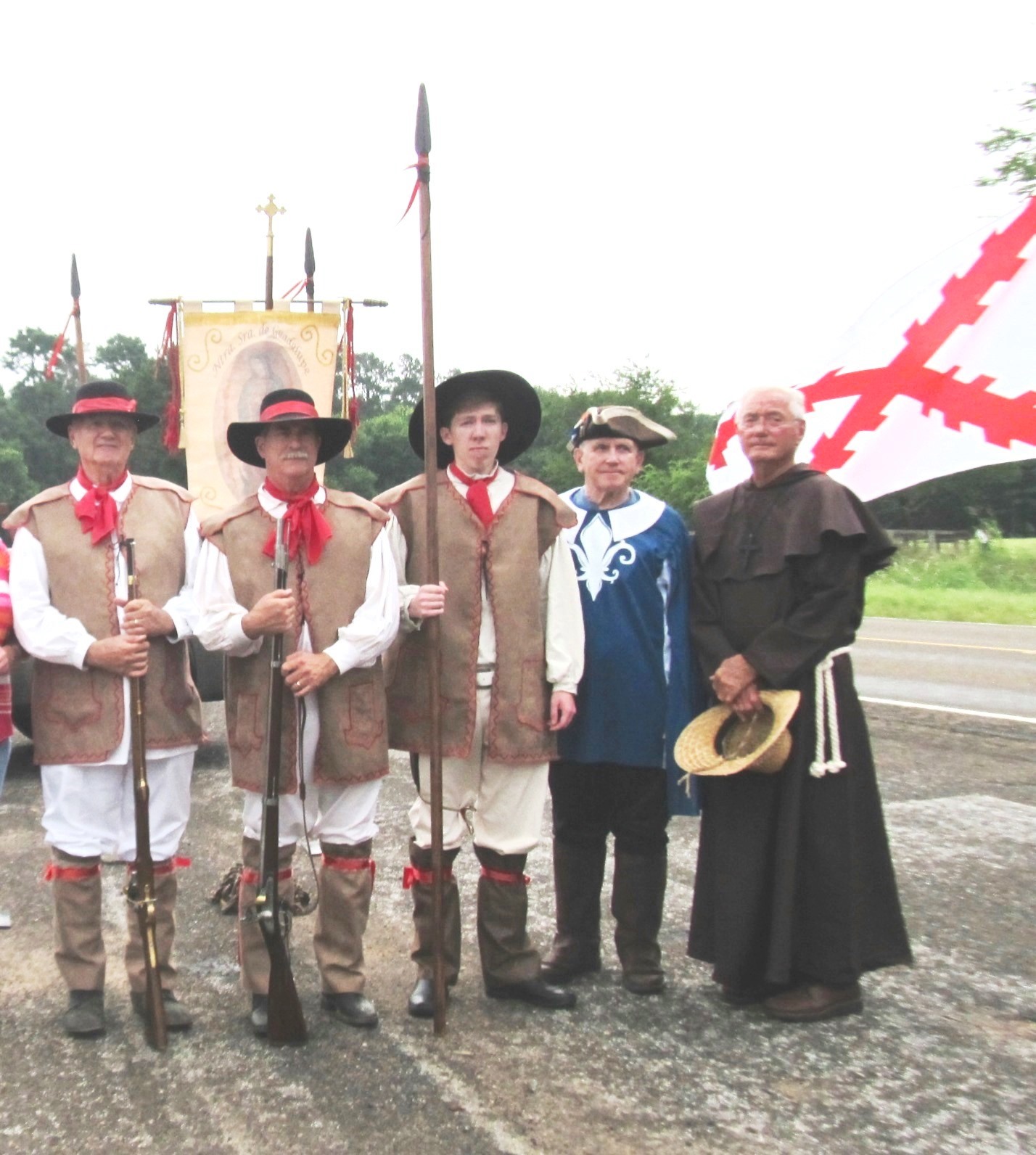 The Spanish Soldados (soldiers) L to R Bill Earley, Jeff Opperman and Jay Jackson, then Jimmy Partin as Louis Juchereau de St. Denis and Tommy Slay as Father Manuel Castellanos.
