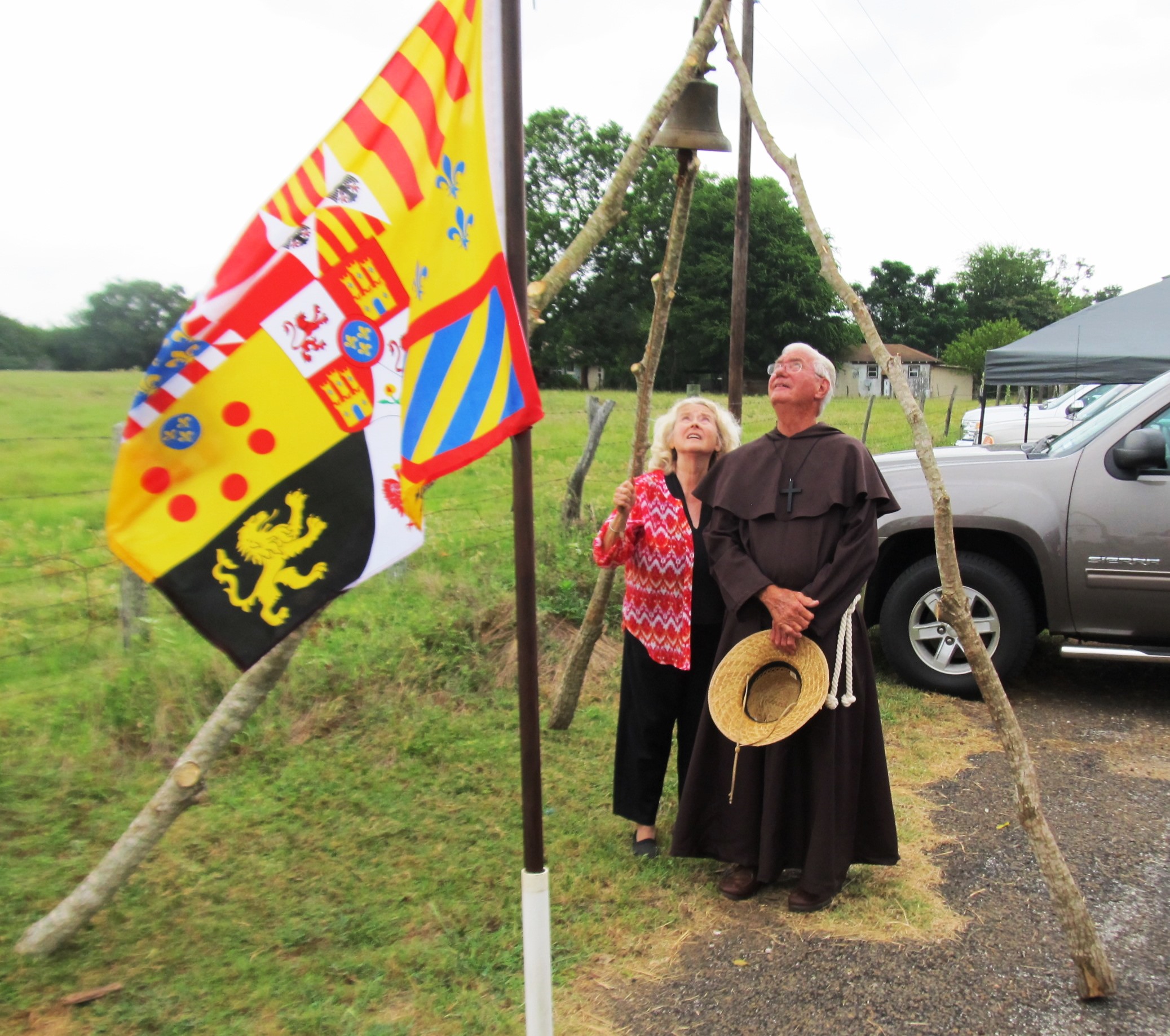 Deborah Burkett, Chair Cherokee County Historical Commission with Tommy Slay, the Chairman of the Nacogdoches County Historical Commission ringing the bell, with the Spanish Flag in the foreground. Both are members of the Nacogdoches Reenactment Planning Committee for the four missions rededicated in July 2016.