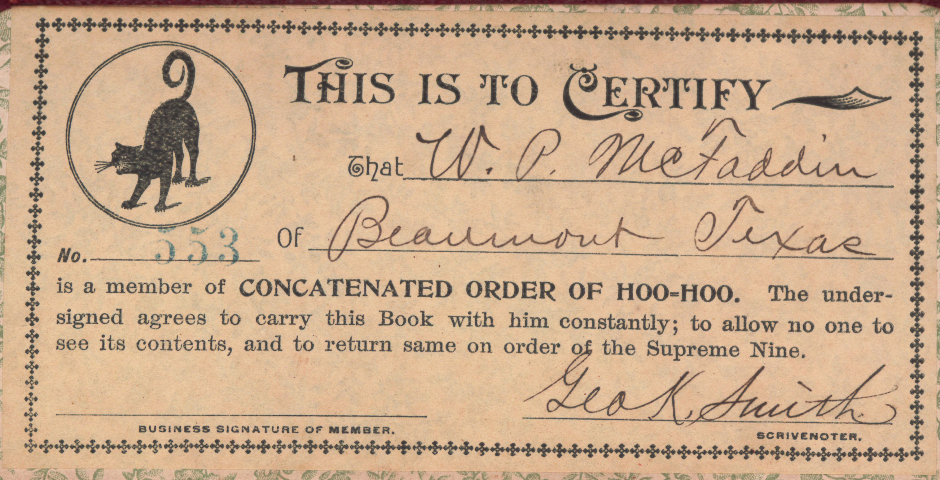 Beaumont Enterprise, August 31, 1919; https://en.wikipedia.org/wiki/Concatenated_Order_of_Hoo-Hoo