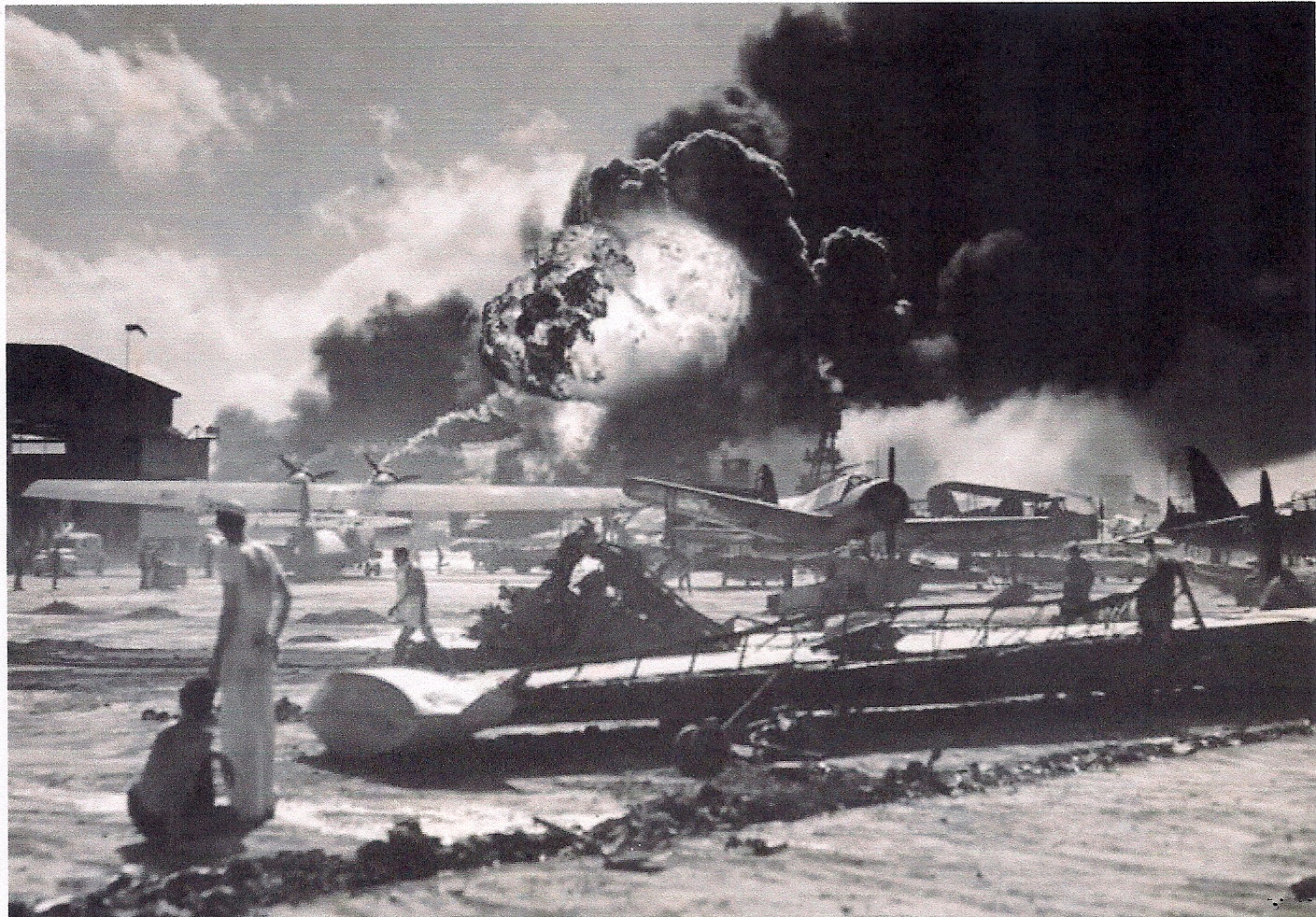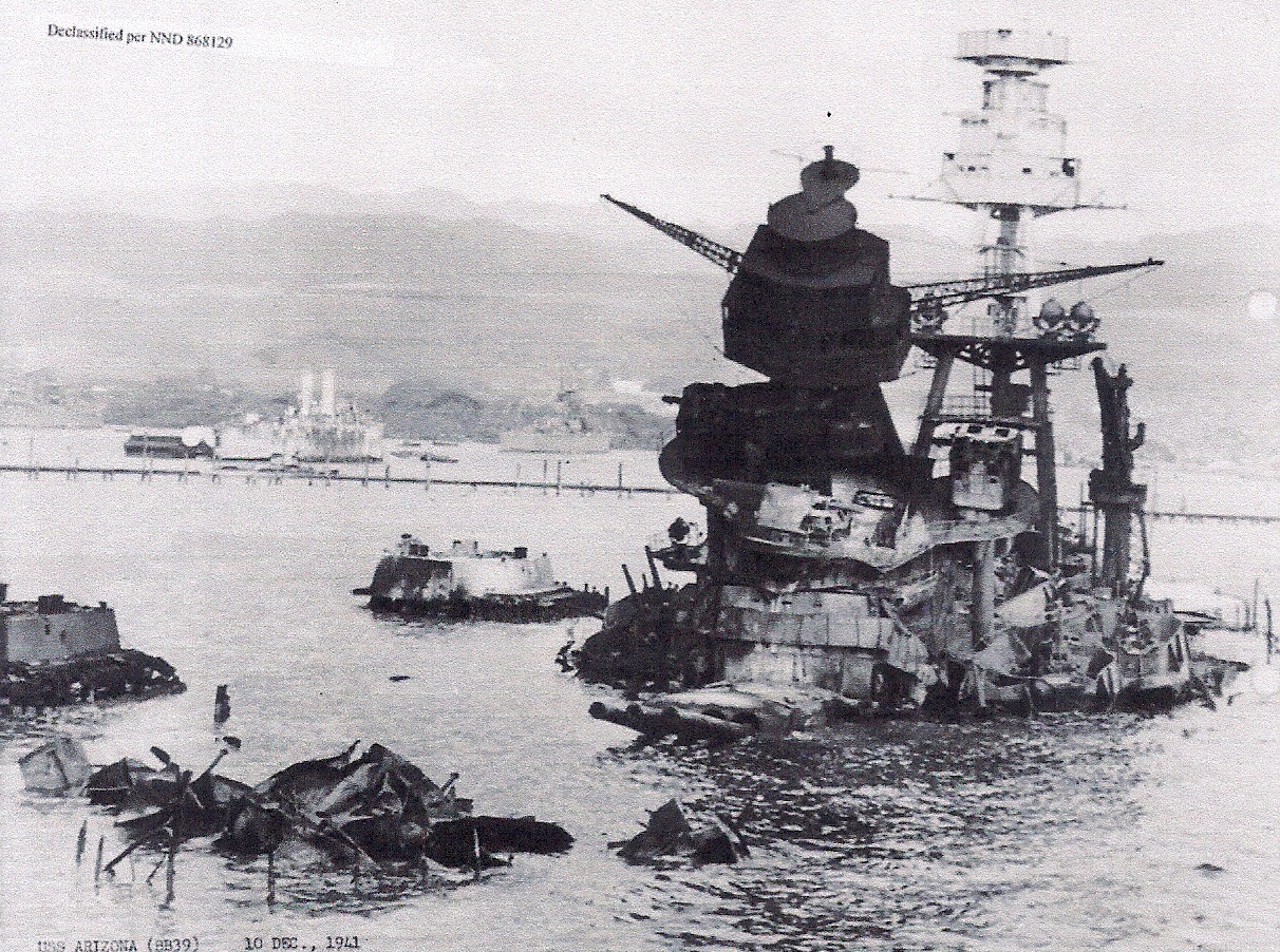 The attack was devastating. The USS Oklahoma was hit by several torpedoes and began to slowly roll over, the USS California was hit by two torpedoes, the USS West Virginia began to sink after being hit, the USS Nevada was hit in the bow yet it began to get underway, but the most seriously damaged ship was the USS Arizona. With a thunderous explosion she blew up and started to burn after a bomb had smashed into the forward magazine. Witnesses and crewmembers who survived stated that the giant battleship seemed to almost lurch out of the water. In just minutes down went the USS Arizona carrying 1177 members of its crew with it.