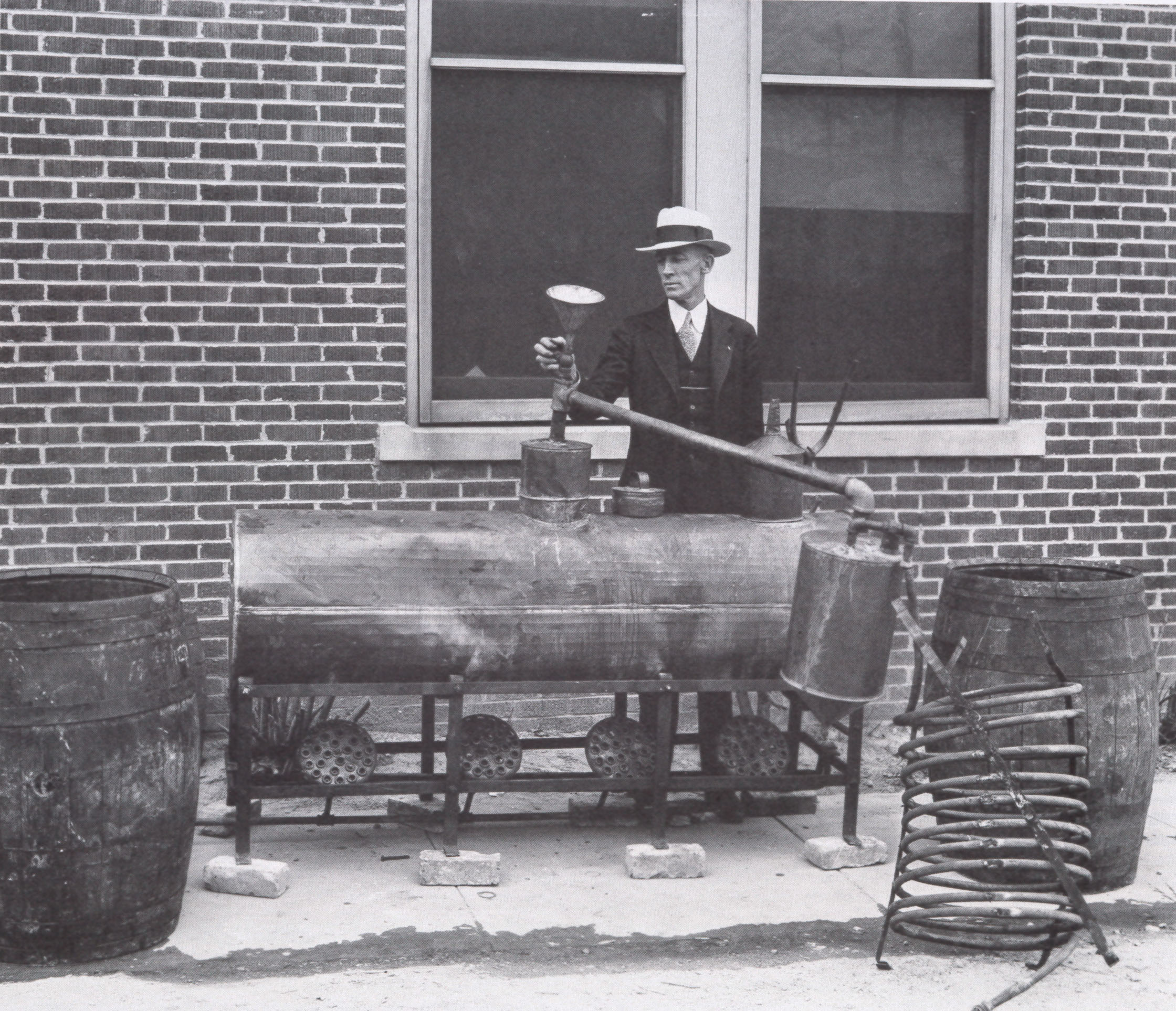 Beaumont Police Chief Carl Kennedy displays a still captured in a raid during Prohibition.