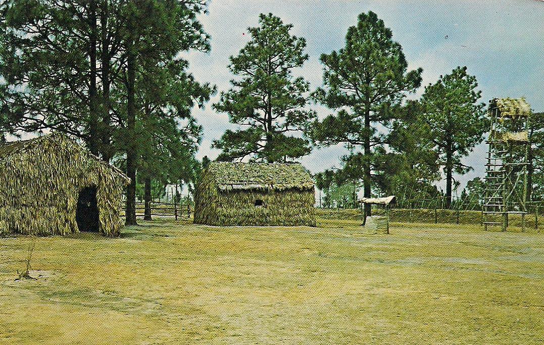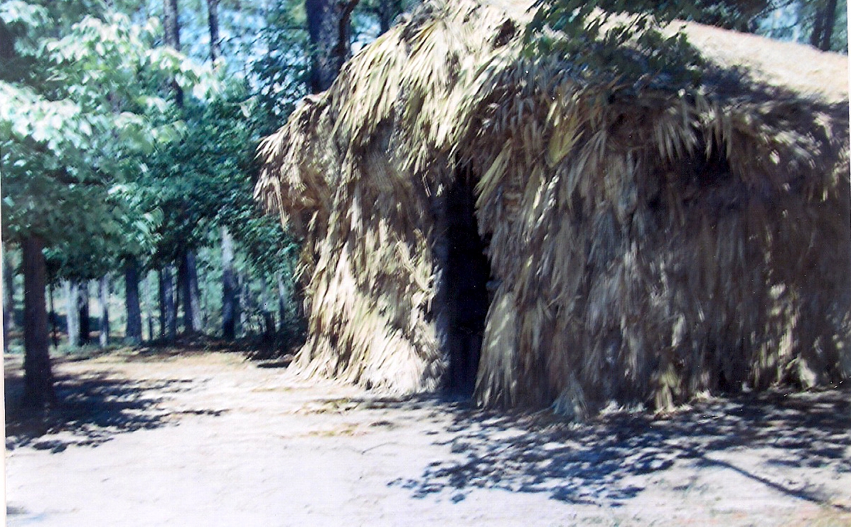 Picture of one of the hootches in one of the Vietnam War training villages. Palmetto was brought from South Louisiana and was put on the huts to provide realism. (Robertson Collection)