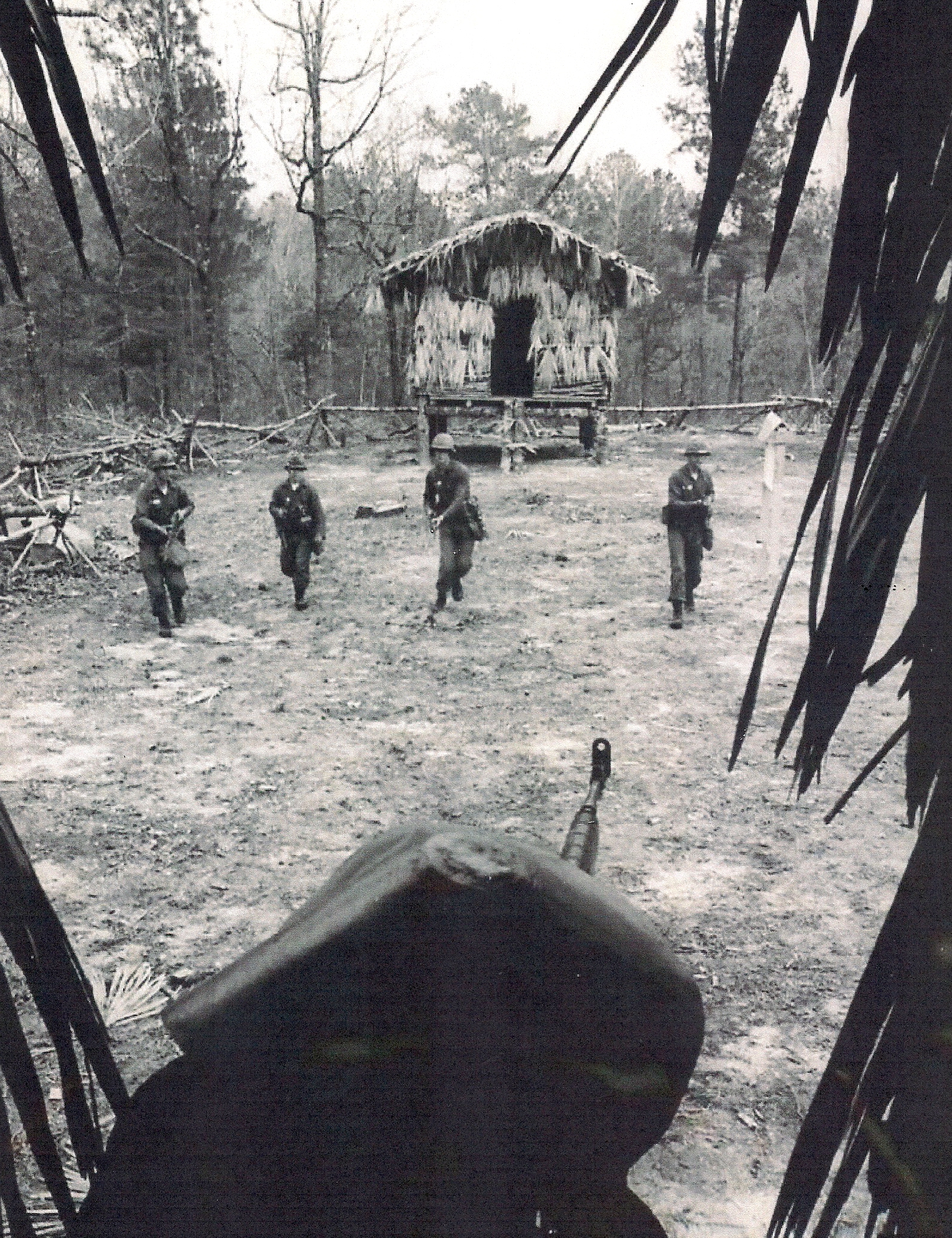 Trainees advancing into a village at Kisatchie searching for the Viet Cong. However the Viet Cong are waiting for them to advance. (Robertson Collection)