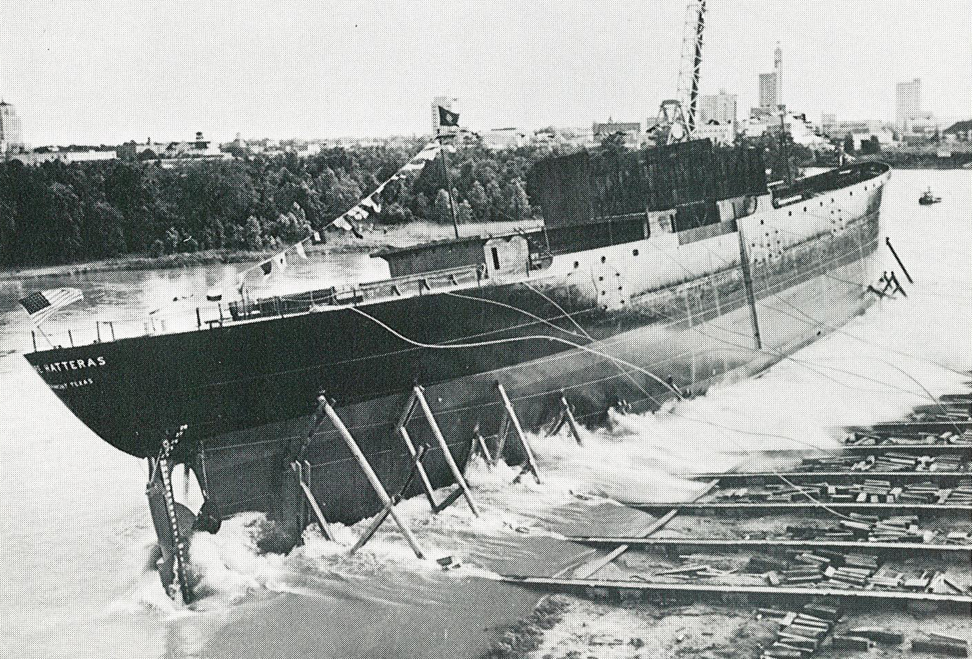 The Cape Hatteras, a C-1 cargo vessel built at Pennsylvania Shipyards, is launched during World War II.