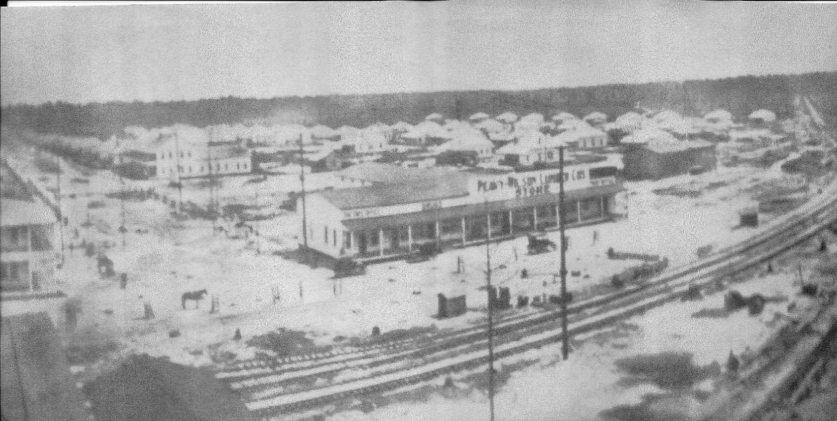 Photograph of the sawmill town of Peason taken from the mill water tower. The Peavy Wilson Commissary is seen in front and the Peason Hotel can be see also on Main St. (Robertson Collection)