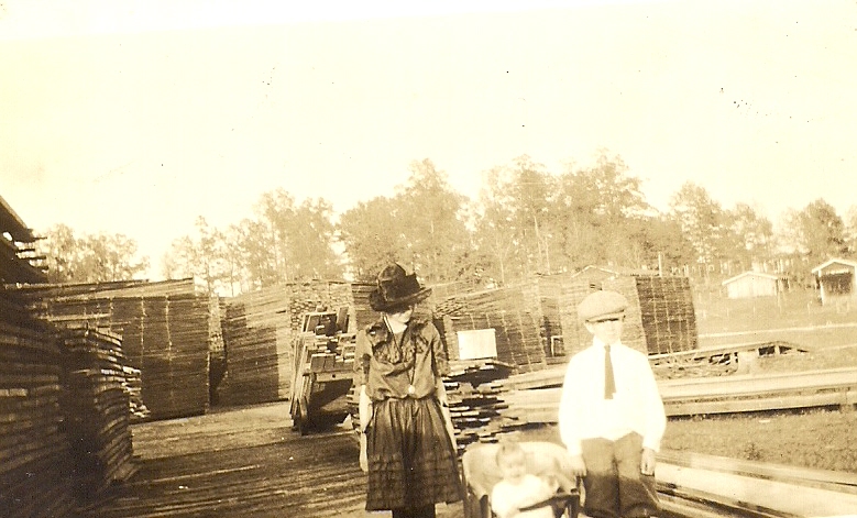 A mother with her son and baby in carriage visiting the mill on Sunday. Large stacks of fine lumber can be seen behind her. (Robertson Collection)