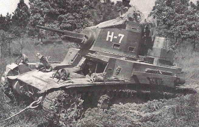 Lite tank stuck in the mud during the Louisiana Maneuvers. This is one of the types of armored vehicles involved in the Battle of Bermuda Bridge in 1941. (Robertson Collection)