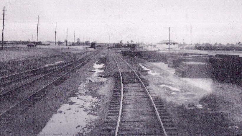 Looking out of the rail yard at Camp Claiborne westward down the Claiborne-Polk Railroad toward Camp Polk. (Robertson Collection)