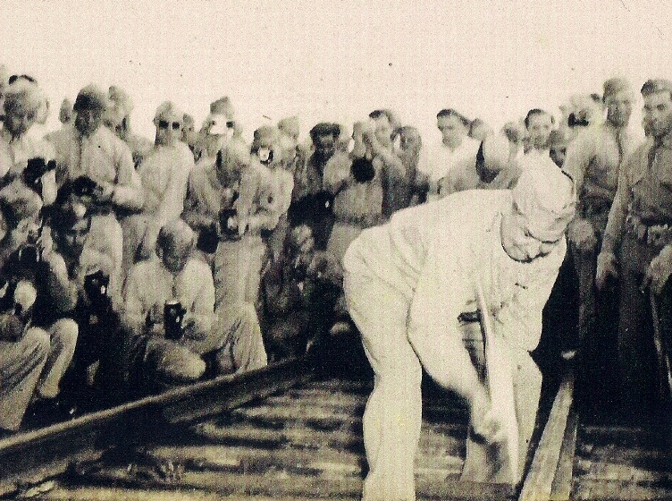 Brigadier General Gray drives the "golden spike" upon completion of the Claiborne=Polk Railroad. (Robertson Collection)