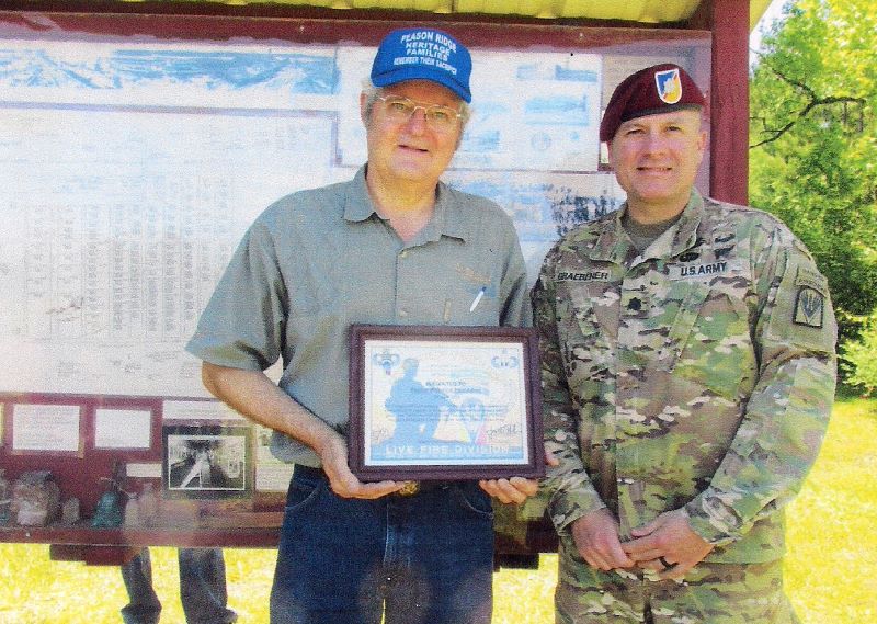 The last stop on the tour was at the Peason Memorial Park located on Hwy. 118. This park has two historical markers and photo kiosks for the public to visit. One historical marker is in memory and honor of the sawmill town of Peason and the other marker is in memory and honor of the Heritage Families of Peason Ridge. The ancestors of the Heritage Families were pleased to stand and have their pictures made at the historical marker honoring their families and the way of life that was lost by these families. The smiles from these ancestors of the Peason Ridge families told me that this tour was a great success! And at Peason Memorial Park Colonel Cannata and Lt. Colonel Graebener presented Rickey Robertson and the Peason Historical Foundation a Certificate of Appreciation for the contributions made to the U.S. Army and the Ft. Polk and Peason Ridge Live Fire Division. A very enjoyable day for the fifty-five people who came out for this tour. And let us always remember the sacrifice made by the Peason Ridge and Camp Polk Heritage Families as they gave up their homes, farms, culture, and way of life so that our freedoms could be preserved. And get ready for next year as we expand our tour route that will cover many more of the historical locations, cemeteries, and home sites on the 75,000 acres of Peason Ridge.