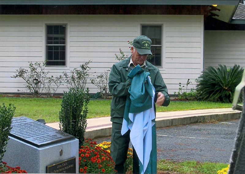 Craig Rice, US Forest Service Employee who was instrumental in obtaining the monument, removes the covering of the monument on the day of the dedication. (Robertson Collection)