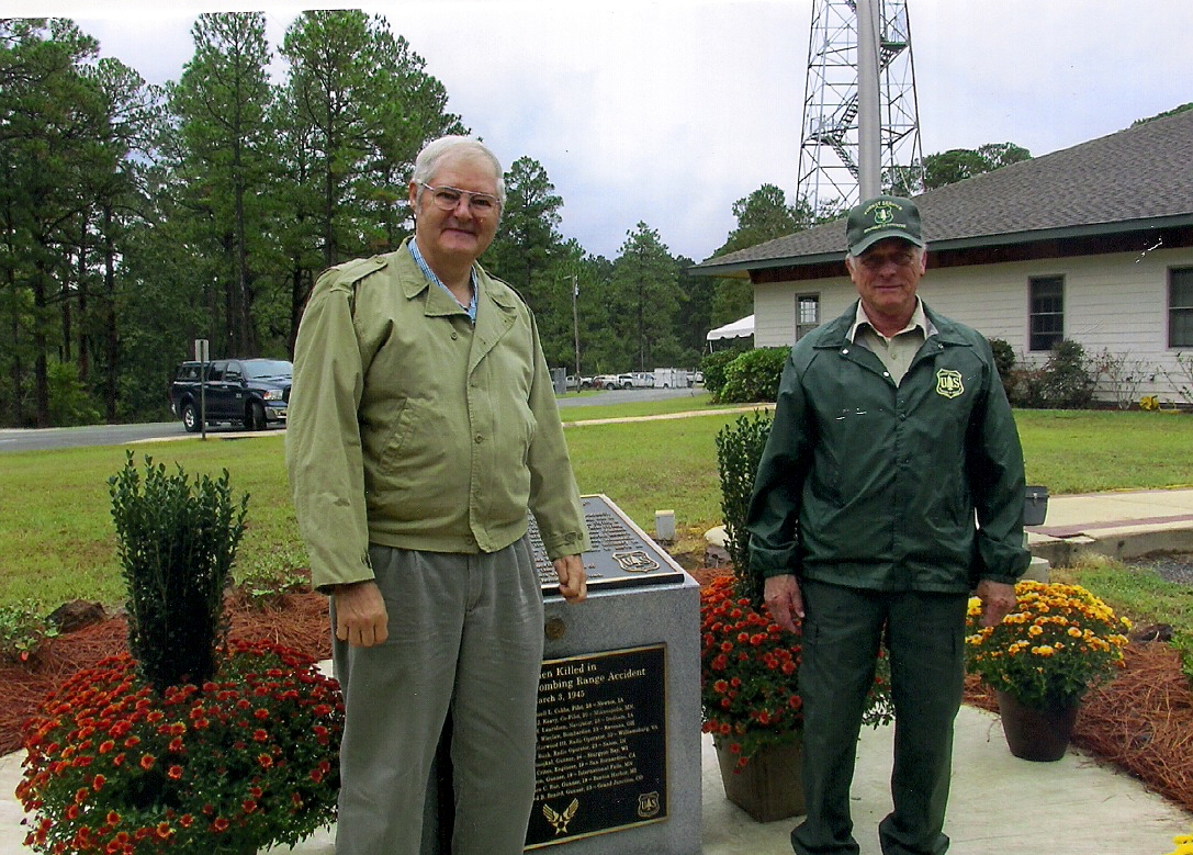 Rickey Robertson and Craig Rice standing next to the monument to the B-17 Crash and Crewmen at the Winn Ranger District Headquarters. (Robertson Collection)