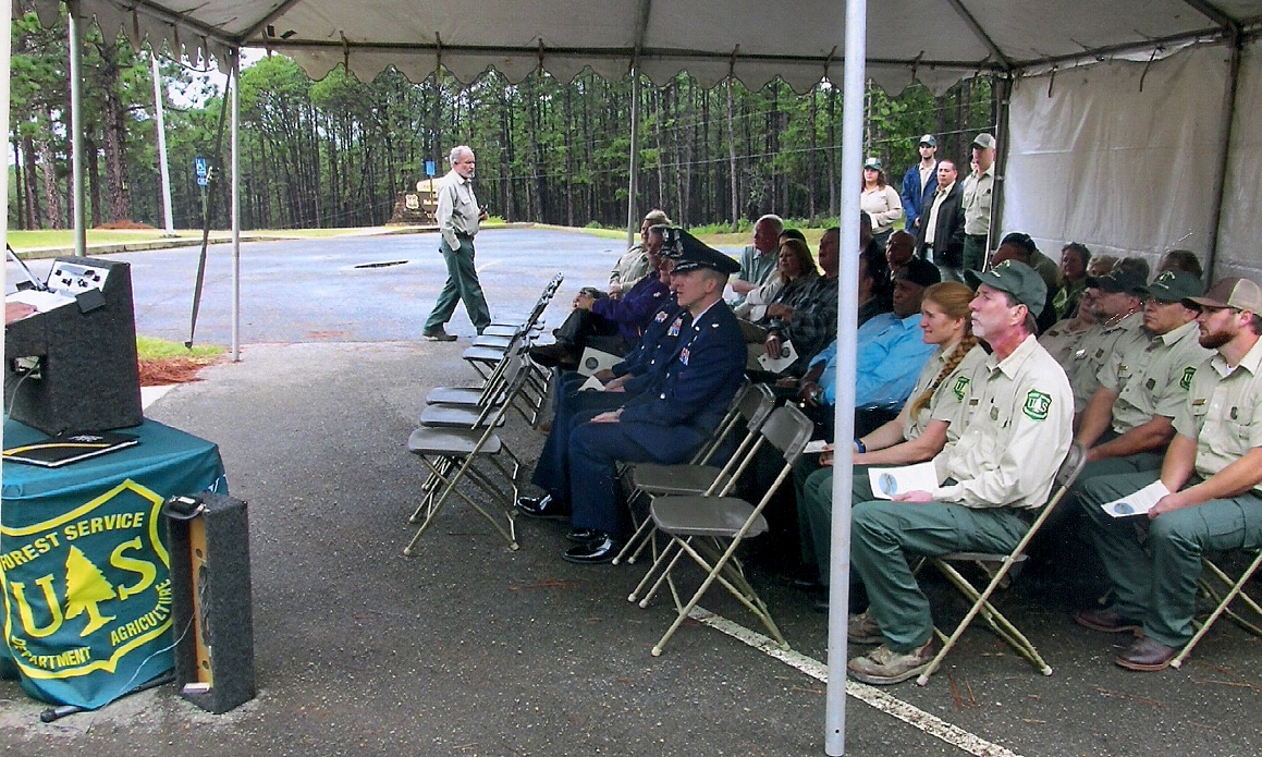 Gathered at the Winn District Headquarters of the Kisatchie National Forest was a good group of folks who came to be a part of this dedication. The Honor Guard from Barksdale AFB came with the Colors, then District Ranger Brad Cooper welcomed all in attendance. Several officers along with Christopher Allen-Shinn, historian of the 2nd Bomb Wing at Barksdale AFB, attended to show they remembered their fellow eleven brave airmen lost so many years ago. District Ranger Cooper conducted a roll call of the crew members, then the Bugler from Barksdale AFB rendered in the crew honor taps. As the notes of taps gently drifted away Craig Rice, a USDA Forest Service employee who was instrumental in gathering the information needed to obtain the monument, came forward and gently removed the covering from the monument for all to see and view. A brave crew of World War II Airmen would now be remembered for future generations with the dedication of this monument.