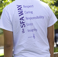 At SFA, our faculty, staff, alumni and students believe in doing things "The SFA Way." We expect the best from ourselves and from each other, and we hold each other accountable when we fail to maintain these standards. Grounded in the five "Root Principles" of respect, caring, responsibility, unity and integrity, Lumberjacks strive for personal excellence in everything that we do.
