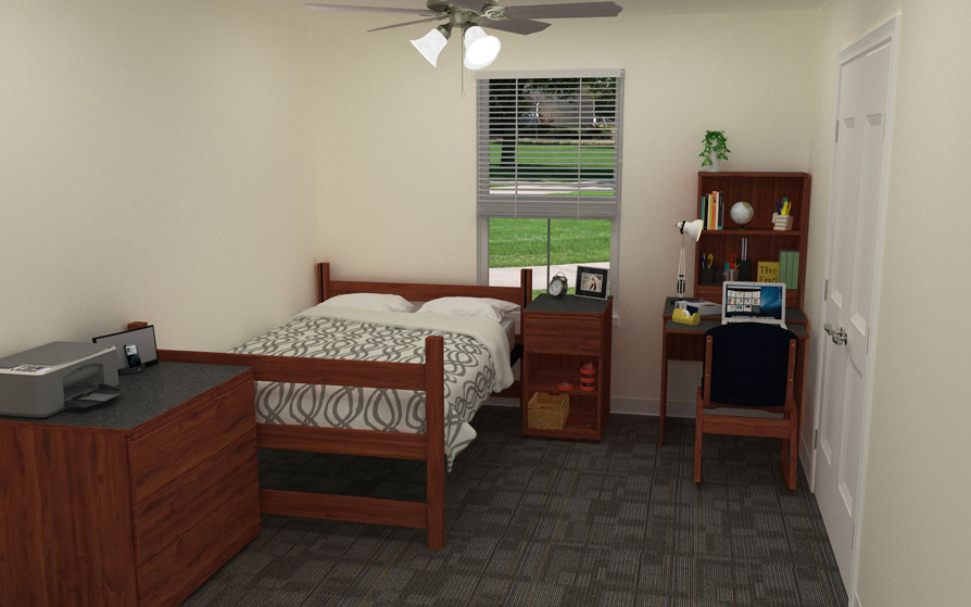 Quad-units: Two-bedroom living with two students sharing each bedroom. All four roommates share the living area, kitchenette and bathroom.