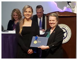 Nacogdoches accounting senior Kailyn Southerland presented Jamie Derrick, lecturer of management, with the Beta Gamma Sigma Professor of the Year Award at the accounting banquet in April 2022.