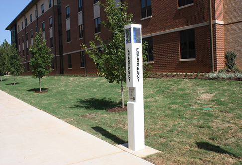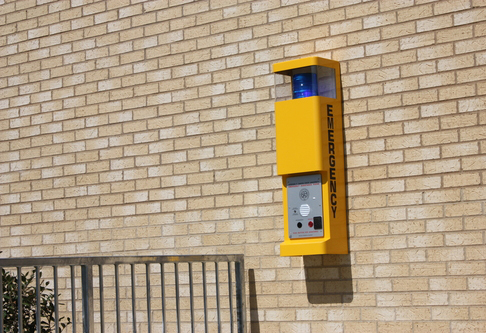 Emergency call boxes have been placed at various locations on the SFA campus. These call boxes are white or bright yellow and are labeled "Emergency" or "Police" in black letters.