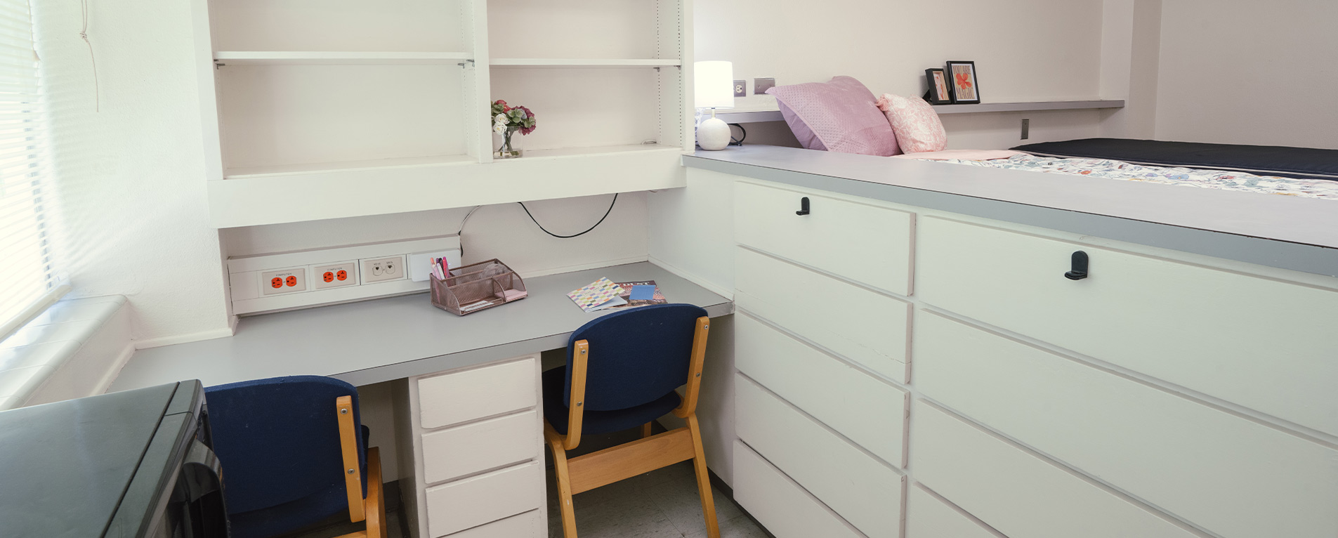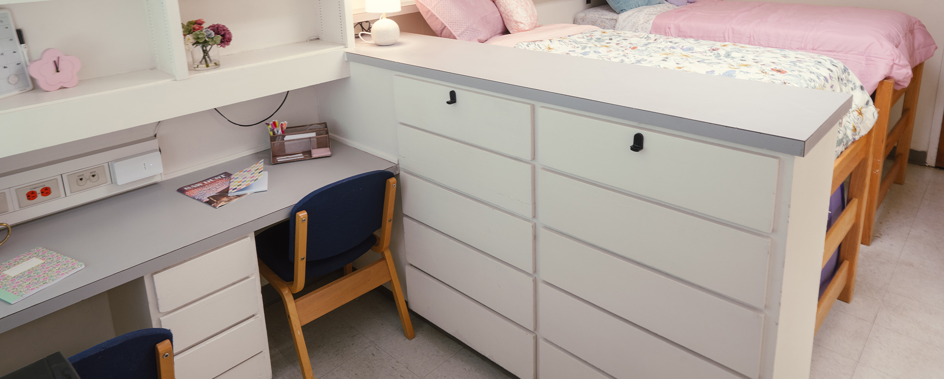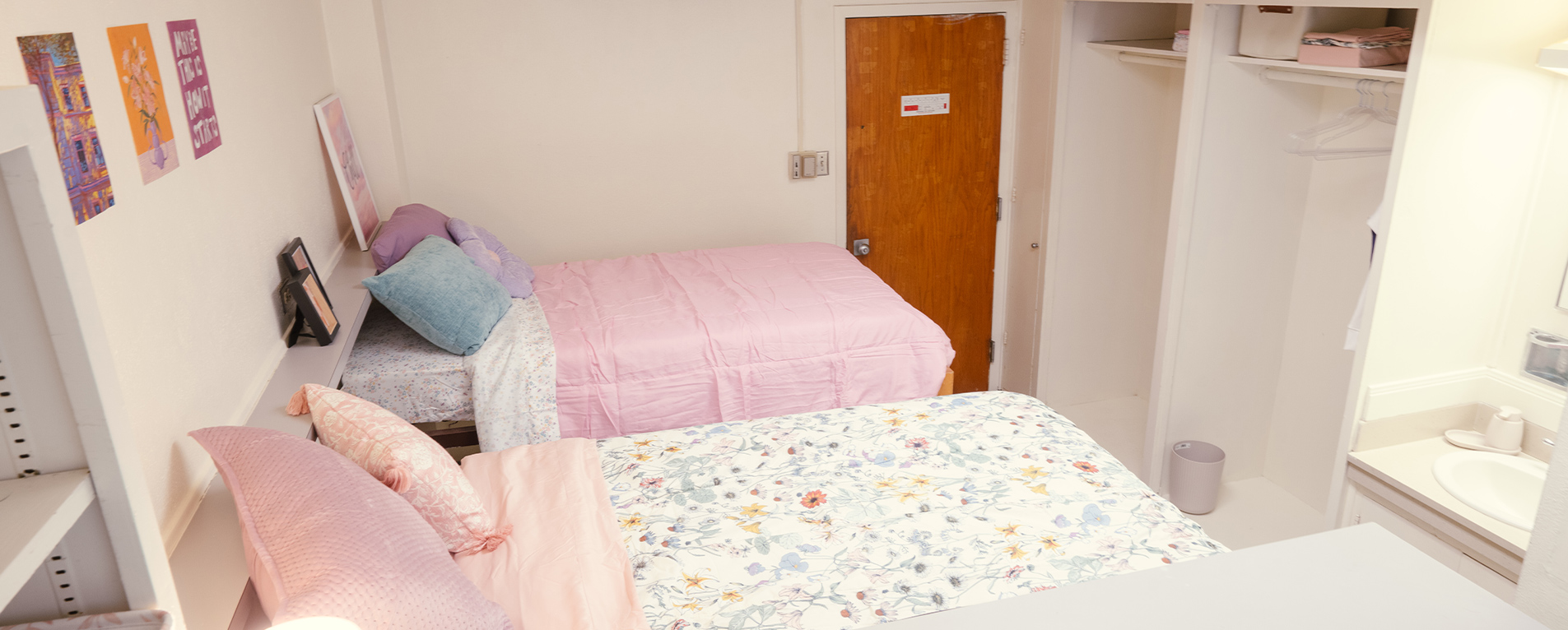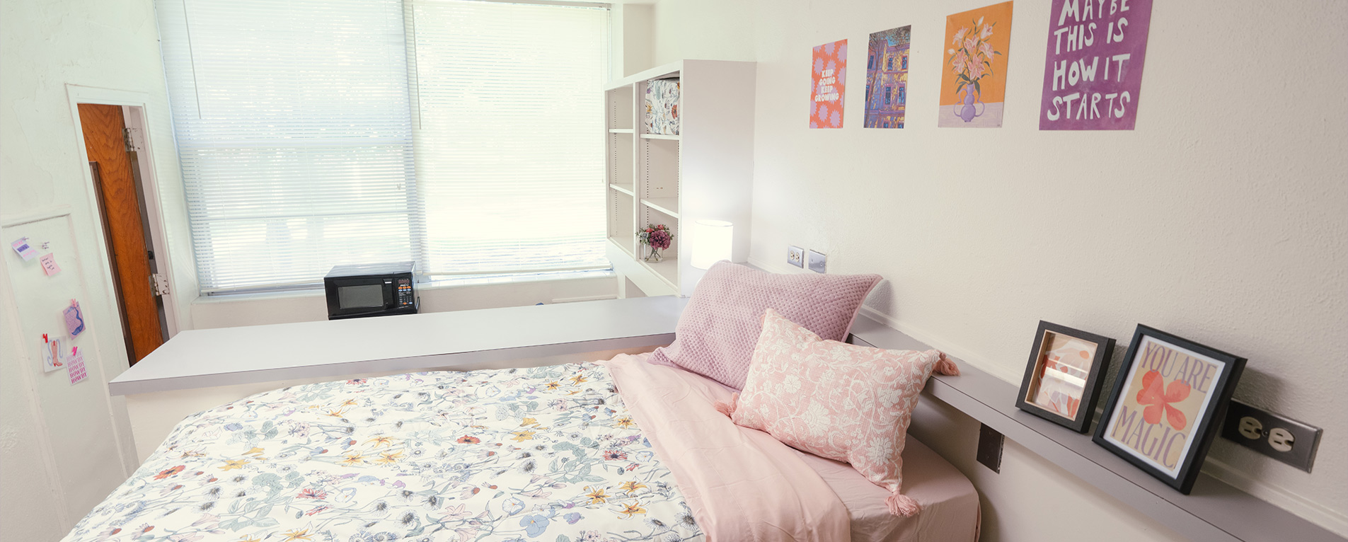 These one-bedroom units house two students. Each unit connects to one neighboring unit through the semi-private suite-style bathroom.