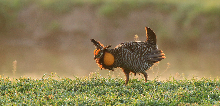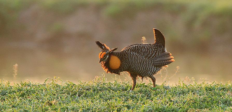 A dense fog engulfed the early spring morning as John Magera '92 led a group of visitors to a clearing on the Attwater Prairie Chicken National Wildlife Refuge. Stepping out of the vehicle, the group stood in silence as the distinct, whirring calls of the critically endangered Attwater's prairie chicken filled the air. The birds' vocalizations, coupled with the rapid thumping of their feet and vibrant, inflated air sacs on each side of their neck, are part of a unique courtship display, known as booming, performed by males in an effort to attract a mate.