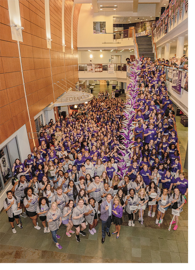 Cover photo: SFA's 11th president, Dr. Neal Weaver, and his wife, Kristi, (center) throw their "axe 'em" hand signs with hundreds of Lumberjack Orientation attendees. Already a regular presence at SFA events, the president shares his vision and hope for the institution's future. Photo by Lizeth Garcia