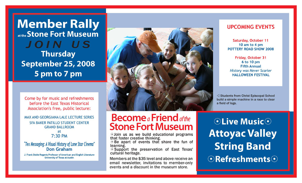 The Museum will host a Member Rally from 5 to 7 p.m. on Thursday, September 25th to launch our new Friends of the Stone Fort Museum. Enjoy music by The Attoyac Valley String Band and light refreshments while you sign up to support the Stone Fort. Then, head on over to the Grand Ballroom in the SFA Baker Patillo Student Center for the East Texas Historical Assoociation’s public lecture. The Max and Georgianna Lale Lecture begins at 7:30 p.m.