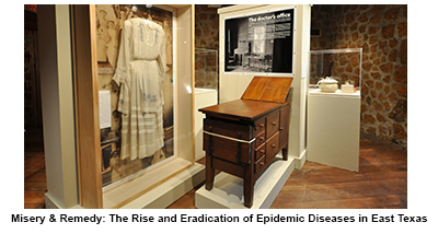 scientific discoveries, and the advancement of public health. The exhibit includes more than 150 artifacts from 23 institutional and private lenders throughout the East Texas region and across the United States. A wide range of objects from bloodletting devices to a nurse’s uniform, a pocket microscope and a ginger jar tell the story of epidemics in East Texas: an international story that is an example of the old adage, ‘all history is local’.
