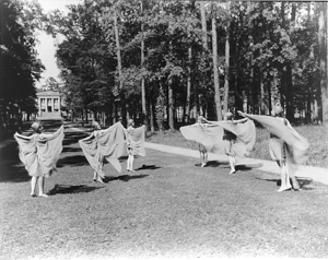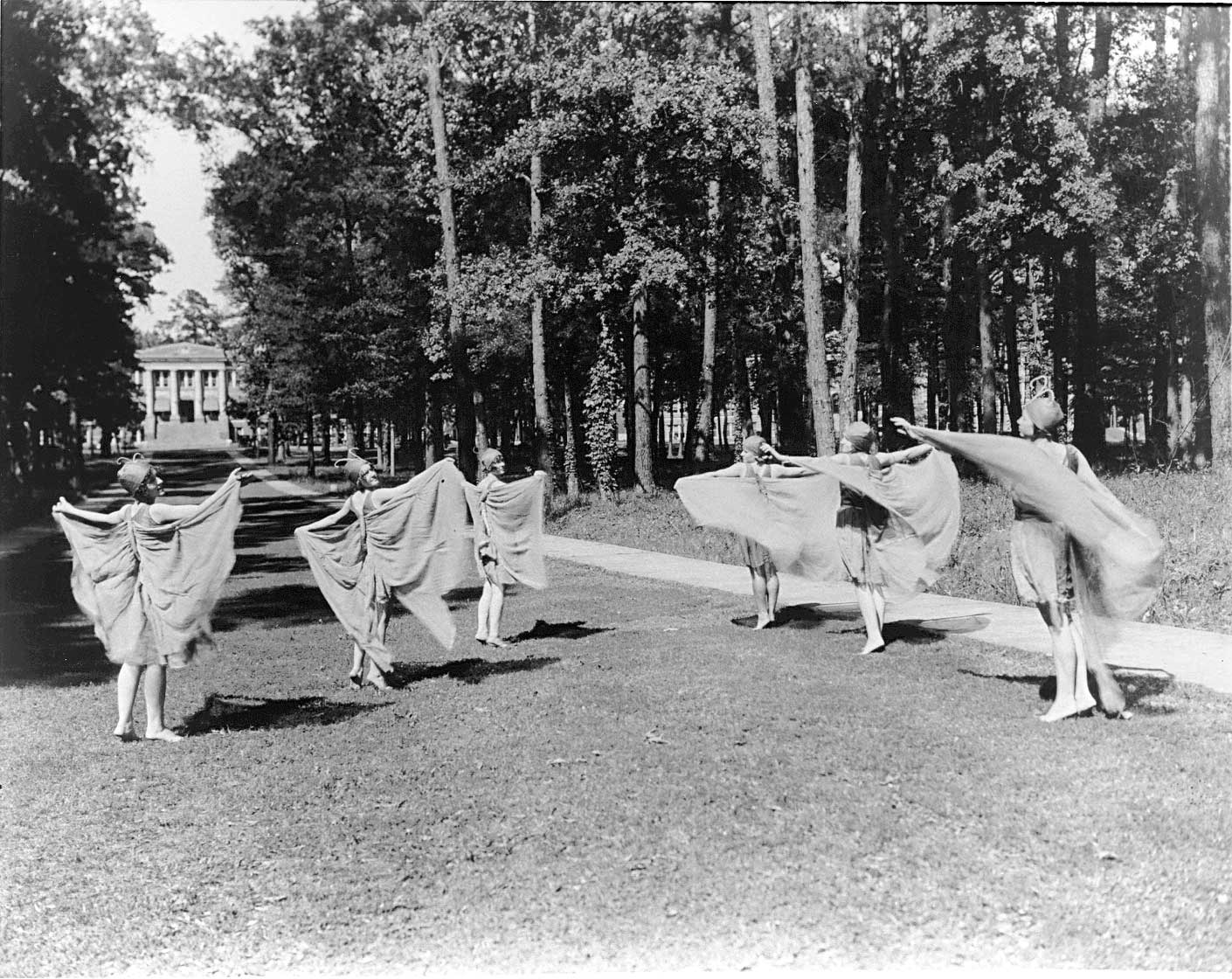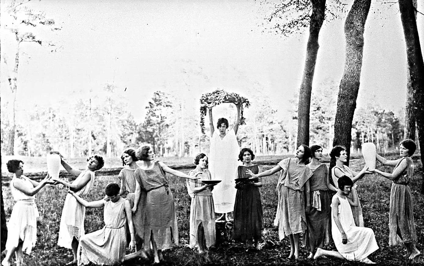 Nymphs on the Vista: Miss Virginia Broadfoot’s modern dance class were photographed here performing in butterfly costumes. Miss Broadfoot’s belief that the foundation of feminine beauty was a healthy body led her to emphasize not only calisthenics and sports activities, but also modern dance. All reports indicate that Miss Broadfoot was a rigorous taskmaster in pursuit of her feminine fitness program. Her ballet-like training for the women also made them popular participants in the theatrical productions of the time.