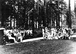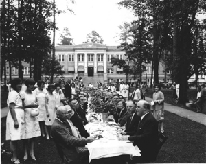 Banquet on the Vista: Legislative Review Panel has a formal lunch on the Vista in 1932. The students and faculty of the Home Economics Department prepared and served the event. The entertainment was provided by the band and choirs. Use of the Vista for official functions like graduations as well as for picnics and even exercise classes was common in the early years before there was a university center or an auditorium. Aikman Gym was the backup in case of bad weather.