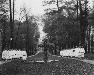 Sunrise Service on the Vista: Sunrise Easter Services on the Vista were a part of campus life from the beginning. The usual routine was to form a cross of the steps of the Austin building, then march down the Vista singing the “Pine Tree Hymn,” “Holy, Holy, Holy,” and “The Old Rugged Cross.” Passages of scriptures were read aloud by ministers, students, and faculty.