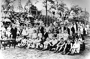 An early intercollegiate track and field meet at Birdwell Field around 1927: The photograph in the ETRC does not have a date. President Birdwell, standing by the table at the left, is preparing to give away the trophies. The "H" on the uniforms of the Sam Houston contestants can be seen in the second row right.