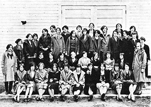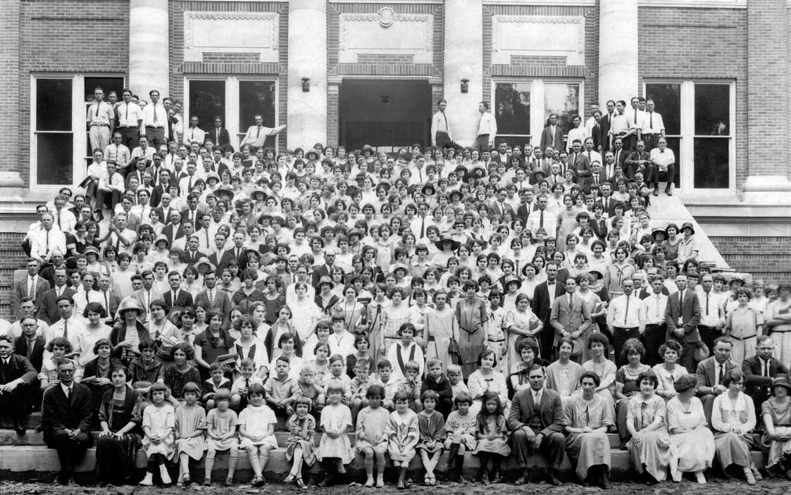 College Portrait: The whole college assembled on the steps of the Austin Building, 1927. Even the students from the Demonstration School are assembled in front. Dr. Birdwell is to the left front of the picture.