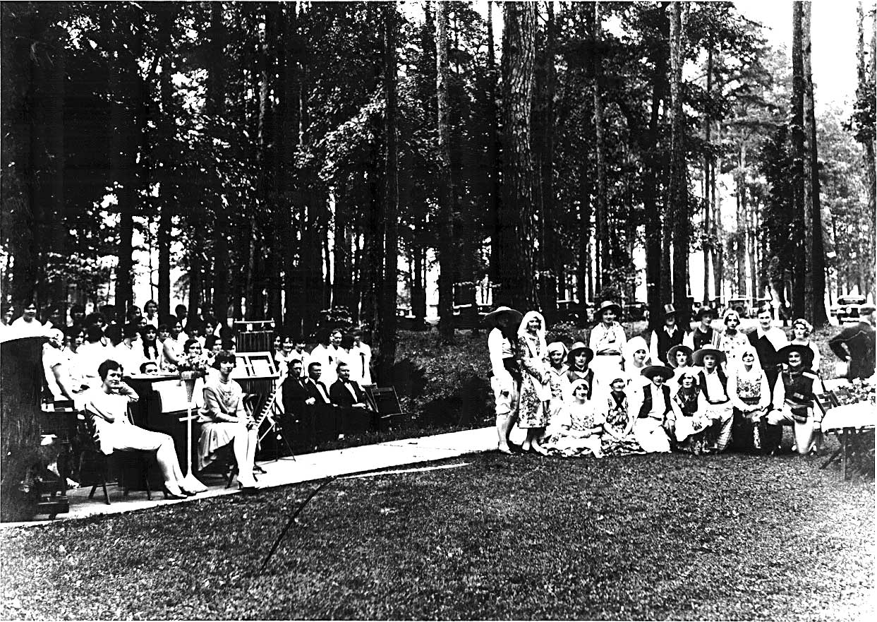 Band on the Vista: Pageants, entertainments, graduations, luncheons, etc. were all held on the Vista. This 1929 photograph shows the SFA orchestra on the left and the participants in a drama on the right. Think how much trouble it would have been to move two pianos half way down the Vista? What if it rained?