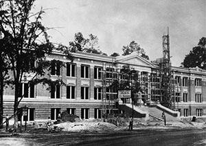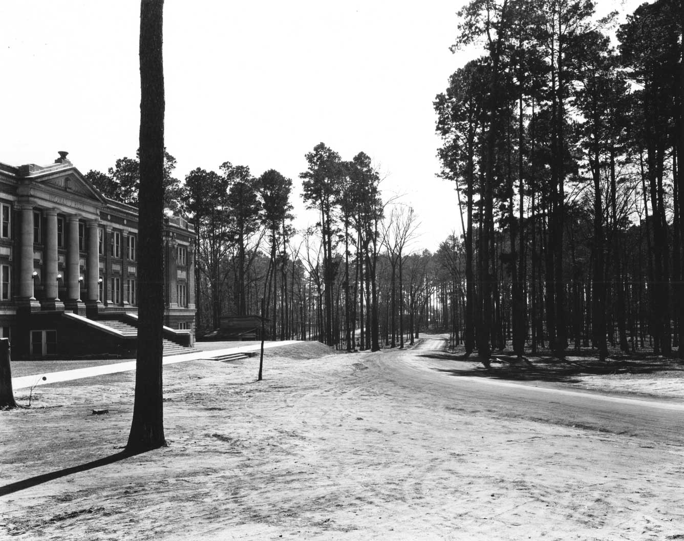 Campus Drive in front of the Rusk Building: The vast nature of the pine forest ("Owl Woods" as it was known before 1922) can clearly be seen. There is no paving, just a trail through the woods. Paving was the next item on Birdwell's agenda which he submitted to the Board of Regents in 1927.