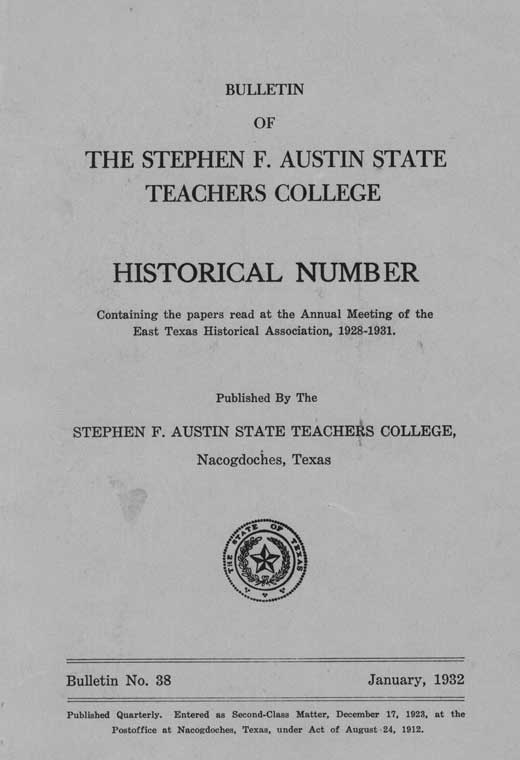 ETHA Bulletin: The cover of SFA Historical Bulletin No. 28 (1932); an earlier Bulletin No. 27 (1928) was the first publication. ETHA No. 28 had contributors from The University of Texas, East Texas State and Sam Houston State Teachers Colleges, and excellent articles from Lois Foster Blount and Rev. George L. Crockett of SFA. Mrs. Blount’s article was on the financial records of the Old Nacogdoches University.