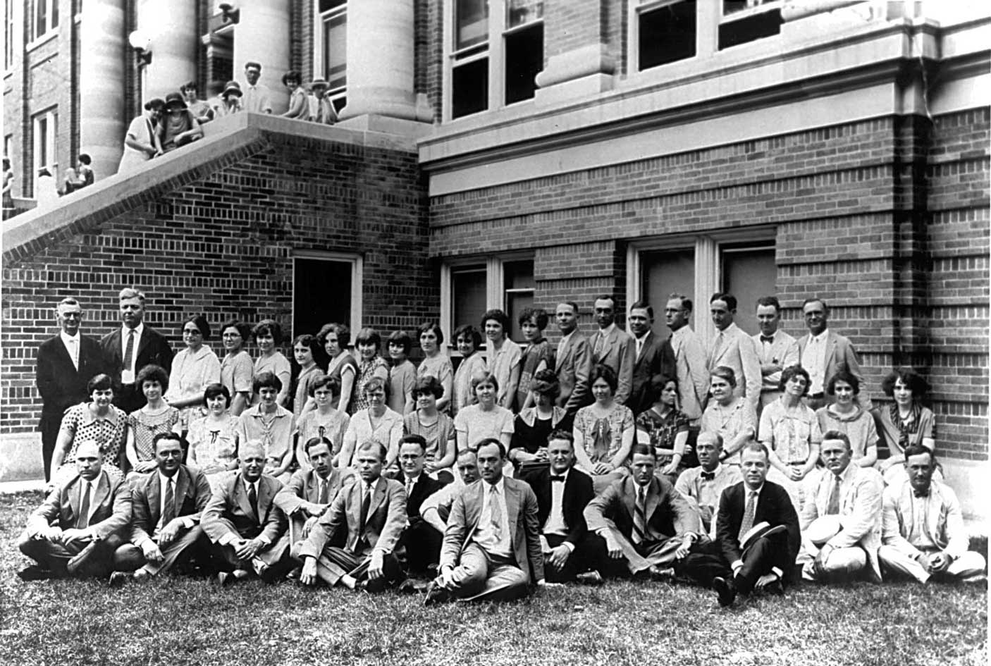 The Faculty, Summer School 1925: The photograph includes the extra faculty added for the summer sessions to handle the load of teachers who came to complete work and also to attend summer institutes. Karle Wilson Baker is in the center on the second row, her hair in a bun. President Birdwell and Superintendent R. F. Davis are on the back row left.