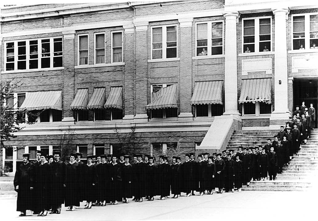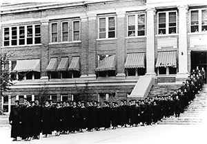 Graduation - 1929: Graduates file out of the Austin Building during a graduation ceremony in 1929.