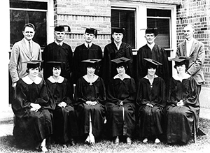 SFA's First Graduating Class, August, 1925: Front Row: Pearl Miller, Virginia Blackwell, Ruth Virginia Fouts, Lela Oxsheer, Gracie Mae Hornbuckle, Gladys B. Johnson; Back Row: Dean T. E. Ferguson, E. P. Gaines, C. Wedgeworth, Luther Garner, Hollis H. Hall, President A. W. Birdwell.